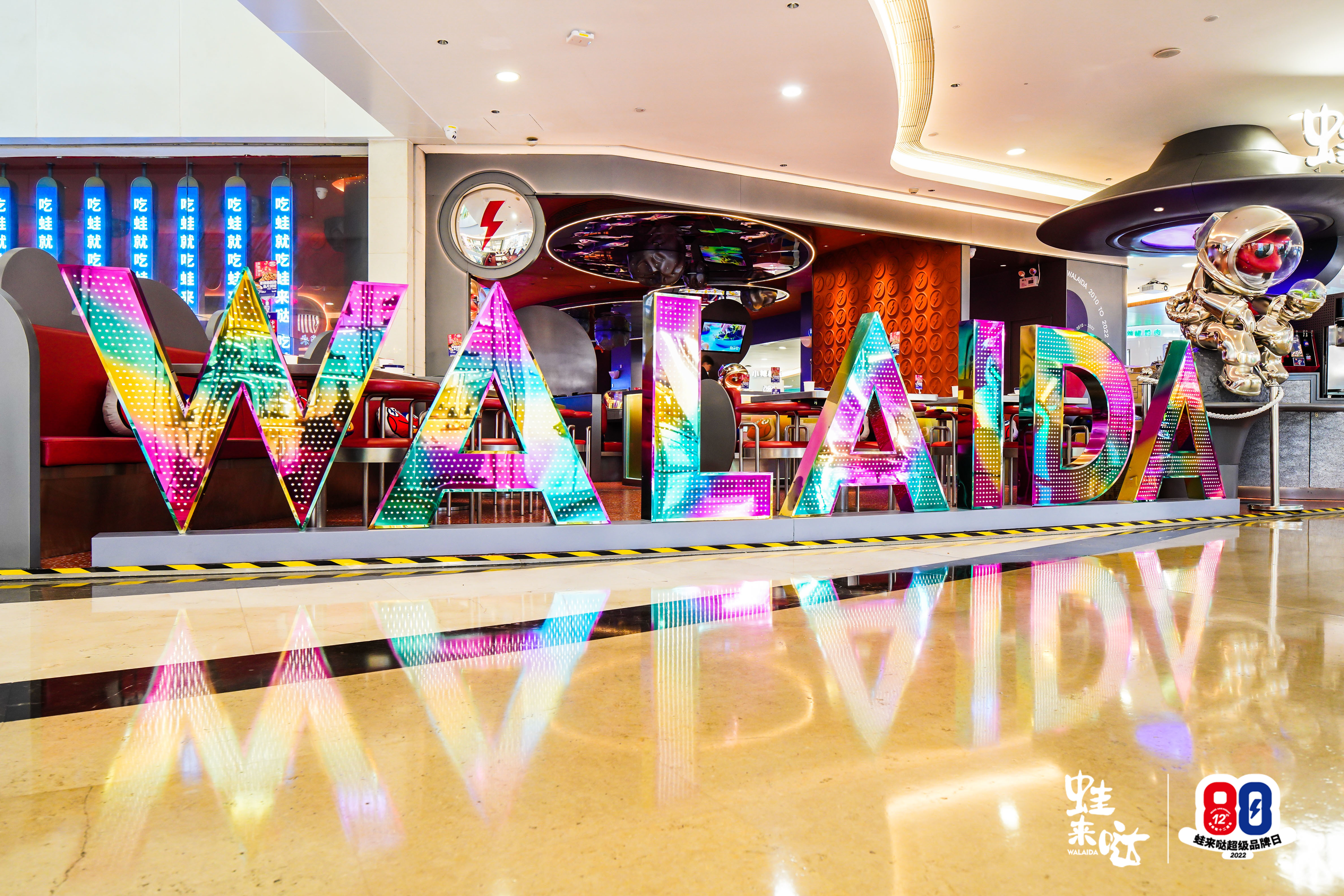 今年的品牌日活动在深圳、广州、长沙三地设有专门的快闪店,以深圳皇庭广场蛙来哒快闪店为例,店外模拟座位的下班专座、红蓝经典撞色的88字样、紧急下班打卡吃蛙区,从门店外观到店铺内饰,处处都体现着蛙来哒品牌日“紧急下班、踩点冲蛙”的热闹氛围。