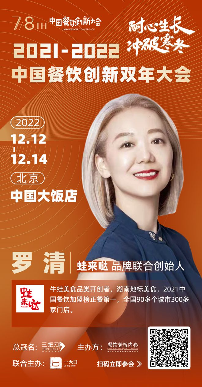 由餐饮老板内参主办的主题为“耐心生长·冲破寒冬”的“2021-2022中国餐饮创新双年大会”将于12月12-14日在北京·中国大饭店举行,蛙来哒作为牛蛙美食品类的开创者、2021中国餐饮加盟榜正餐第一的品牌,创始人罗清受邀参加此次大会。