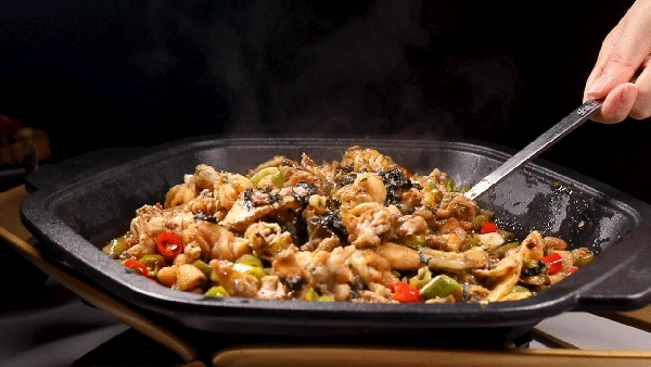 上桌后用小火继续加热,牛蛙和紫苏的香气在空气中弥漫,闻着香味就让人食欲大振。牛蛙一看就是练过的,矫健的身姿和饱满的肌肉,看着都猛吞口水,骨肉分离,一抿就化,肉肉饱满,骨头细滑。