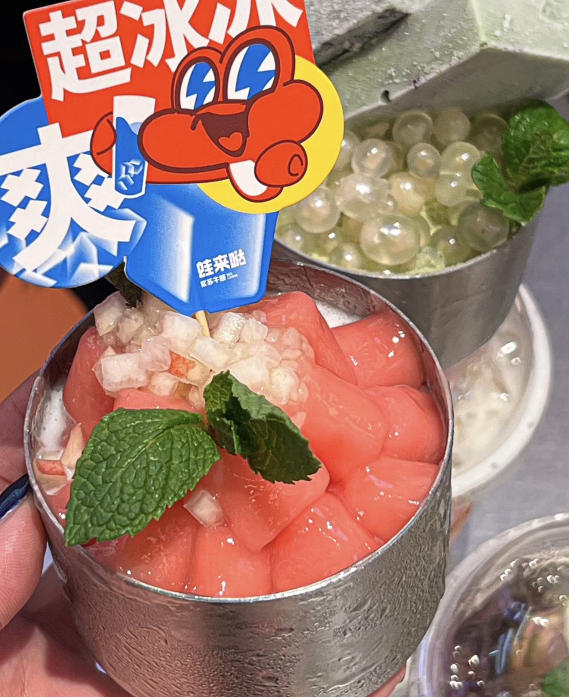 紫苏桃子冰汤圆,甜甜的汤圆和清新的紫苏,桃子果肉清甜可口,冰冰凉凉解辣又解腻。