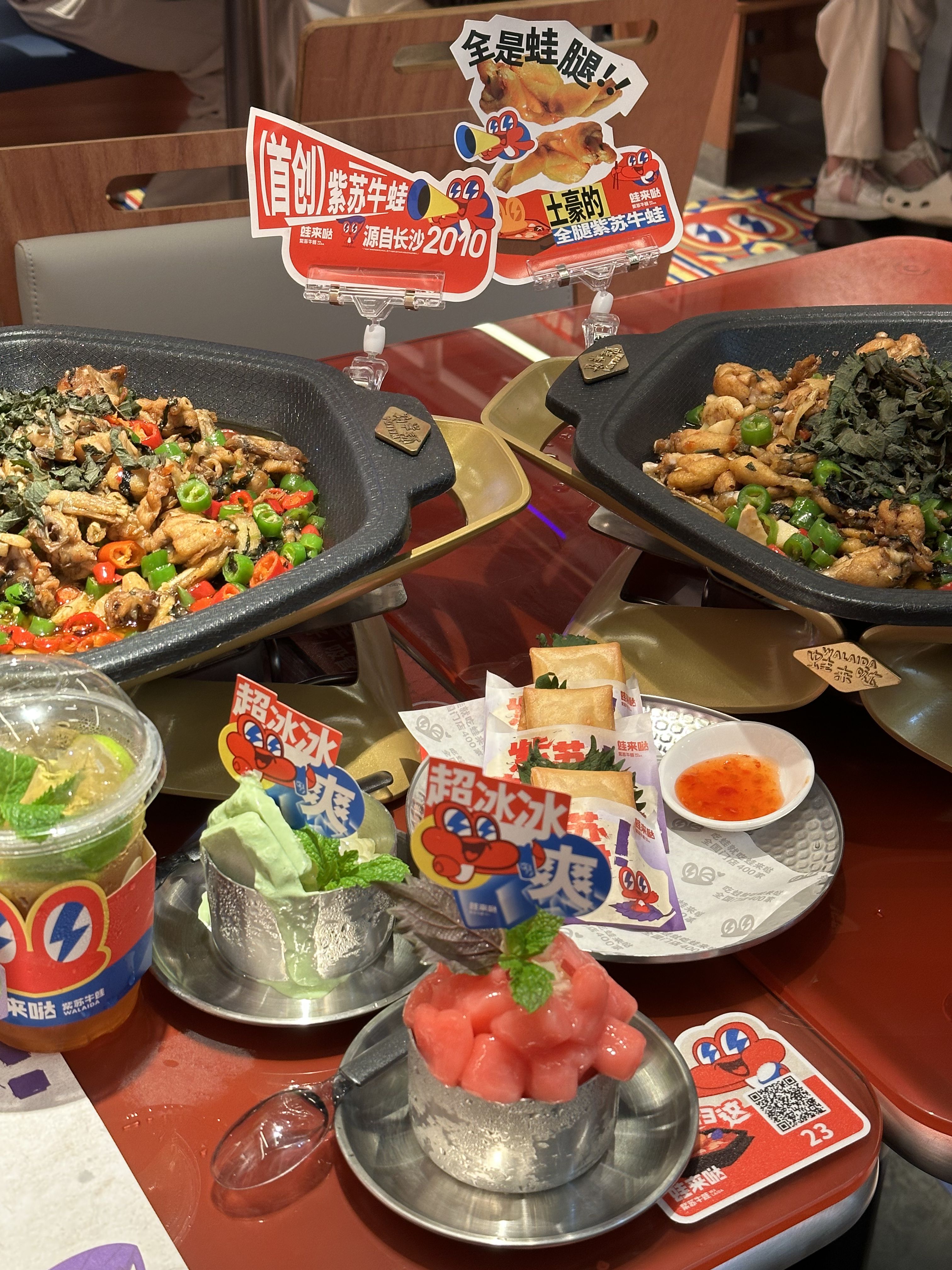 蛙来哒的紫苏牛蛙是该品牌的特创菜品,被誉为“闭眼点”都不会出错的一道菜。这道菜以其香辣的口感和高人气成为蛙来哒的招牌菜之一。此次品牌升级,蛙来哒以紫苏为主题进行门店布置,在全国掀起了“紫苏热”。