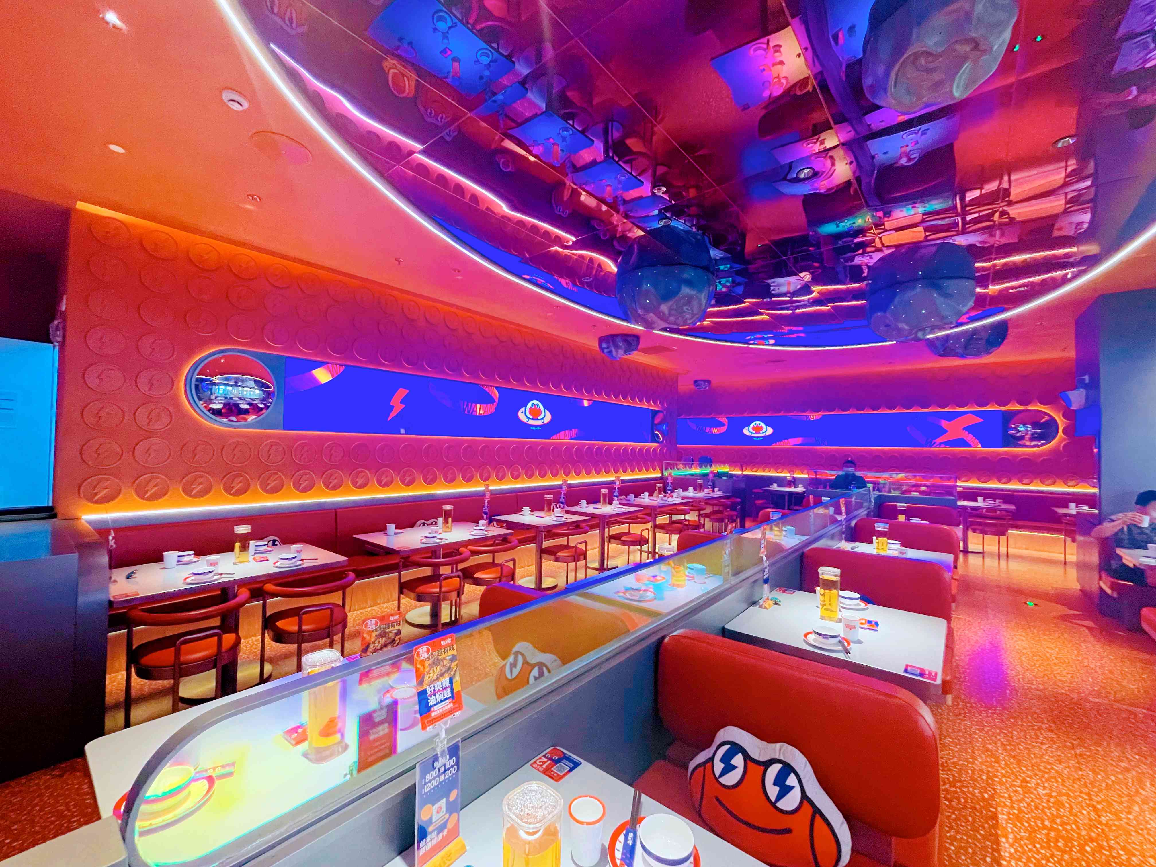 蛙来哒迎合当下年轻人审美的装修风格,一直以来深受蛙粉们的喜爱,从1.0工业风到2.0霓虹幻彩风到3.0黑金风到4.0闪电风,每一种装修风格都深入年轻人的心,成为城市网红美食打卡地。