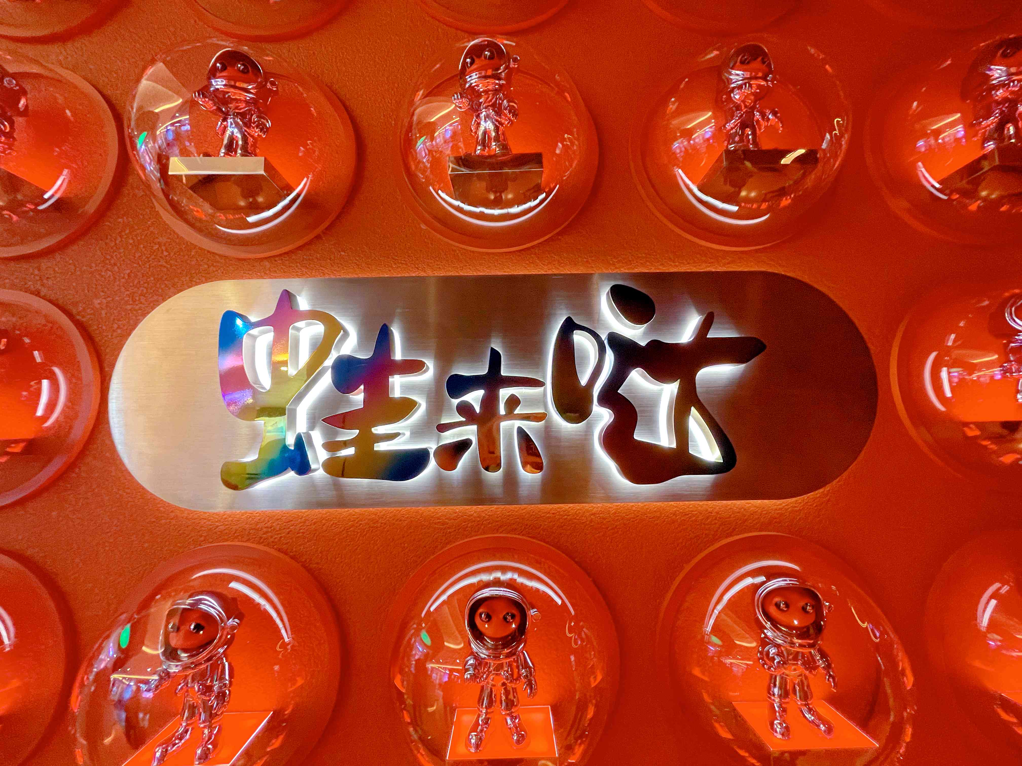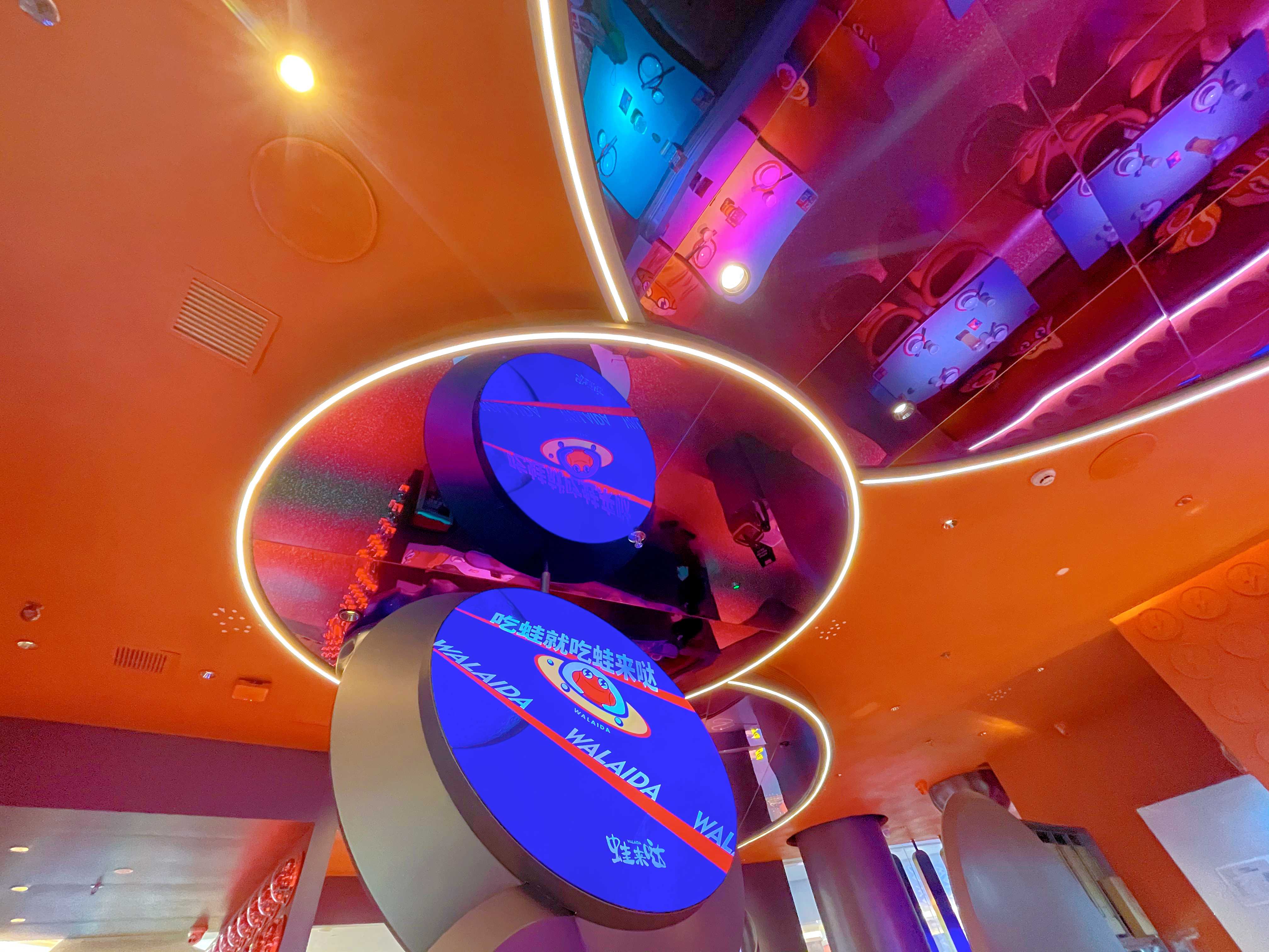 走进店里,先是一面挂满“太空蛙”的墙,然后是到处可见的太空元素,让蛙粉们纷纷都拿出手机咔咔拍照,看来,这次蛙来哒星球科技风的装修风格太受年轻小伙伴喜欢了,整个店里完全像是一个网红打卡地,抬头向上看,连头顶都是太空陨石,加上星光特效,让人仿佛…